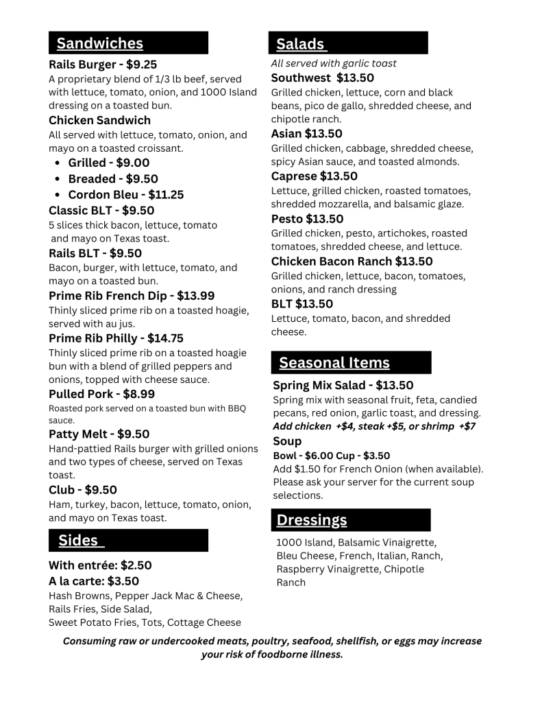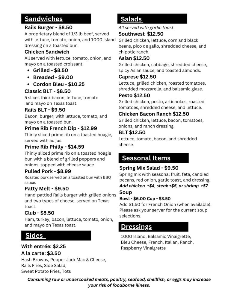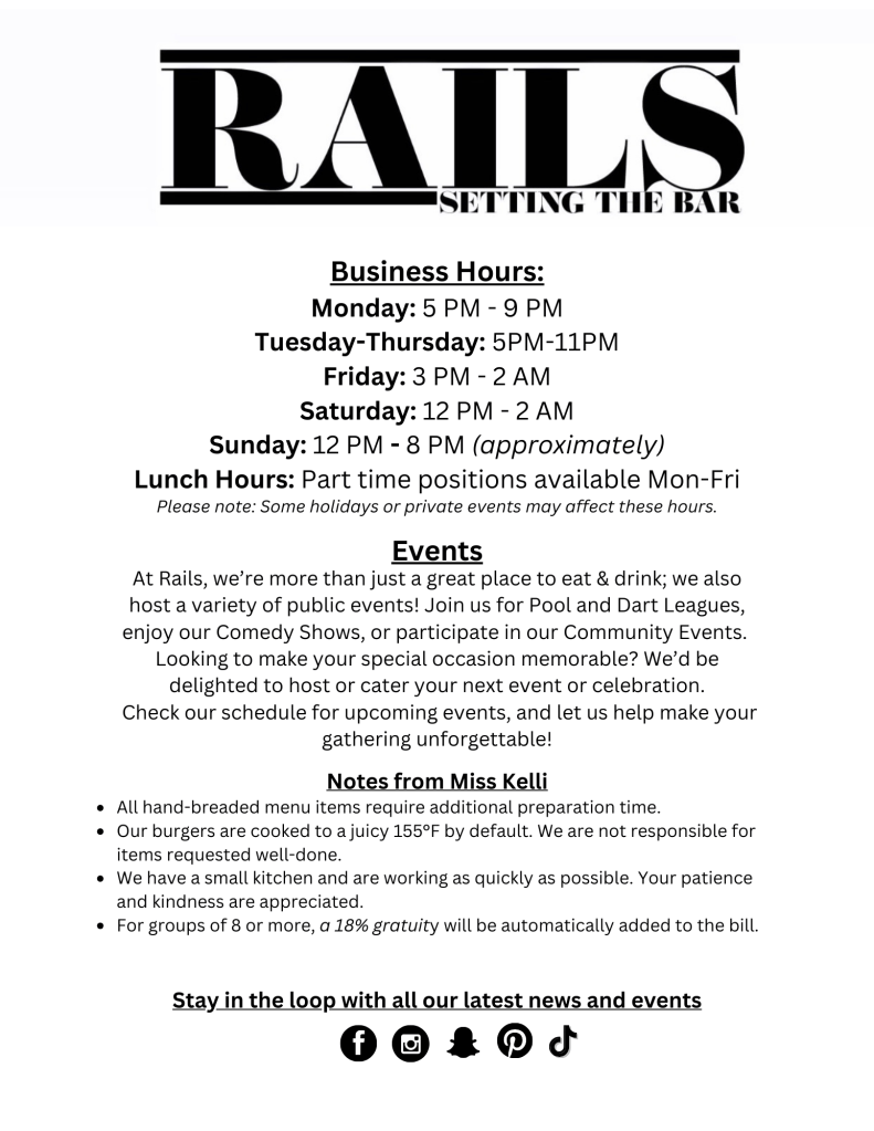 Welcome to Rails Bar and Grill, where we know how to serve up a good time. Dive into our menu, a fusion of culinary creativity and exceptional brews. From savory classics to innovative delights, each dish is crafted to delight your taste buds. Join us for an unforgettable dining experience where every bite and sip is a celebration. Cheers to flavor and fun at Rails Bar and Grill!